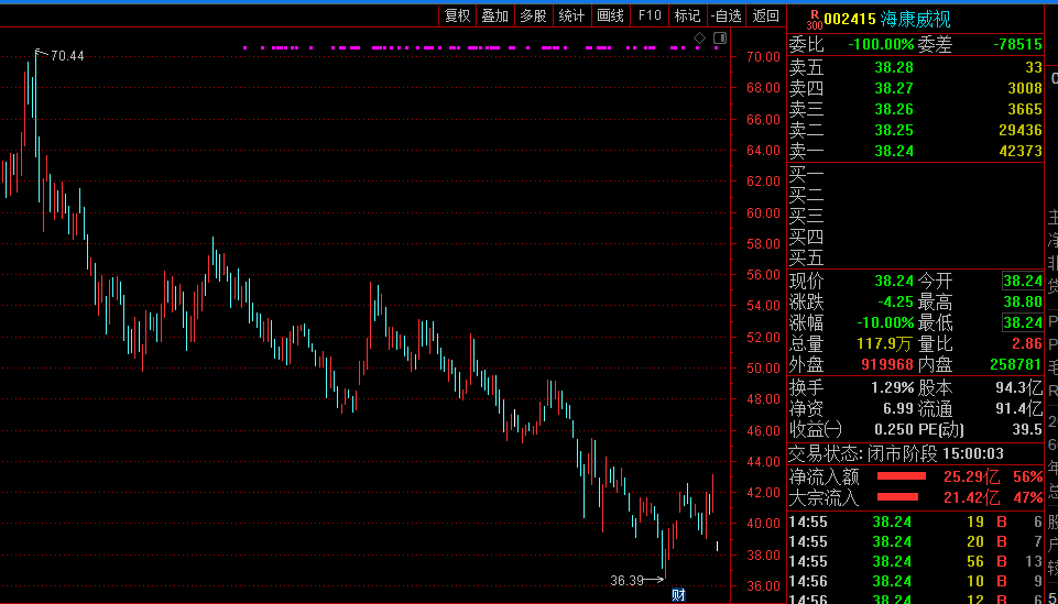 5月5日,海康威视放量跌停。截至收盘报38.24元,跌10%,全天成交金额45亿元,为年内最大日交易金额。