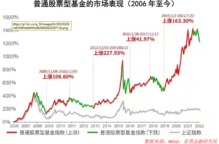 如果用另一个更具有说服力的普通股票型基金的市场表现,可能更能说明这种趋势。由于上证指数的编制及成分股的问题,这一被认为是A股走势的代名词往往并不能真正反应两市的市场表现。因此我们以更加综合性质的普通股票型基金的市场表现来衡量。