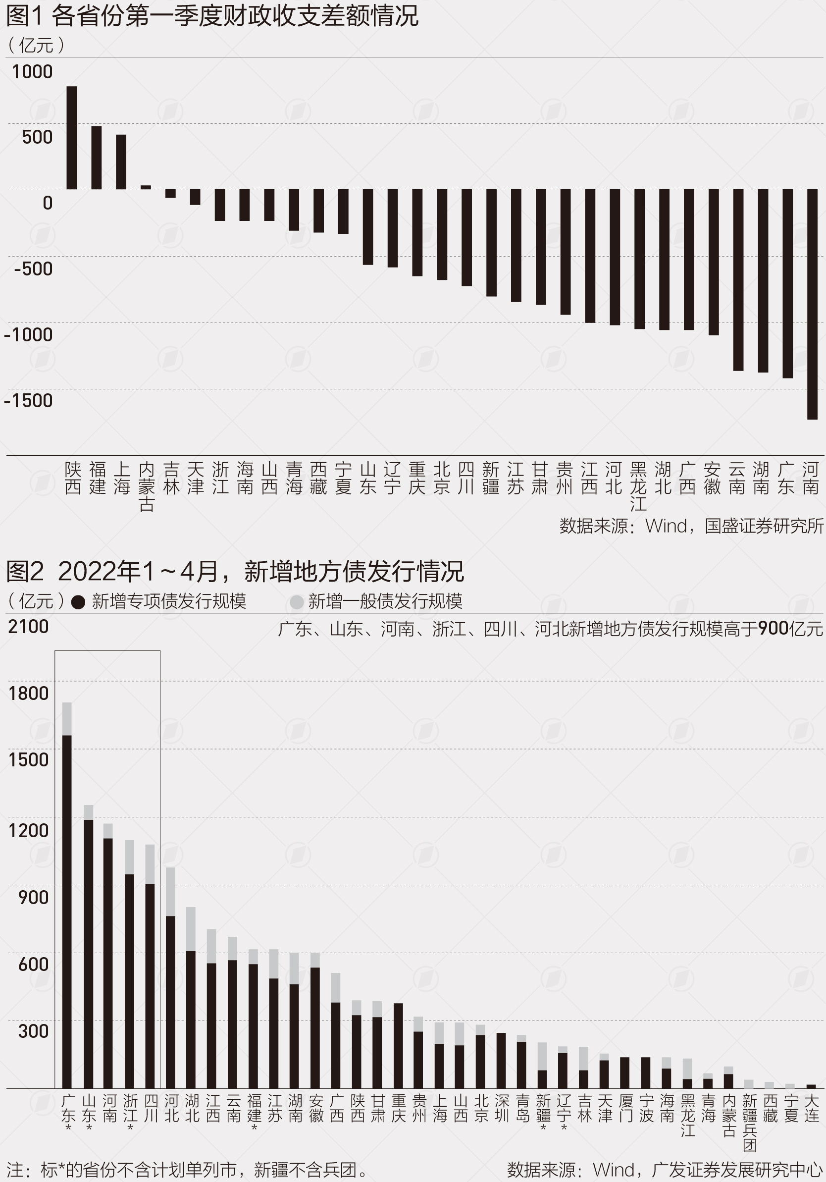 根据广发证券发展研究中心数据,今年1〜4月新增地方债16813亿元,超过2019〜2021年同期,占全年新增地方政府债务限额43700亿元的38.7%。其中,广东新增地方债发行规模最大,达到1727亿元;其次是山东,发行1263亿元;河南、浙江、四川3个省新增地方债发行规模在1000亿〜1200亿元。