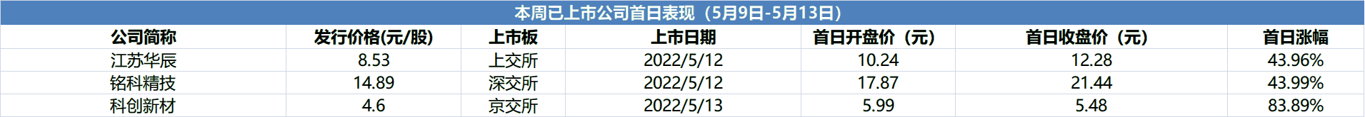 上周共3只新股上市,均没有“破发”,其中江苏华辰、铭科精技实现开盘涨停。涨幅情况分别为江苏华辰涨43.96%、铭科精技涨43.99%、科创新材涨83.89%。