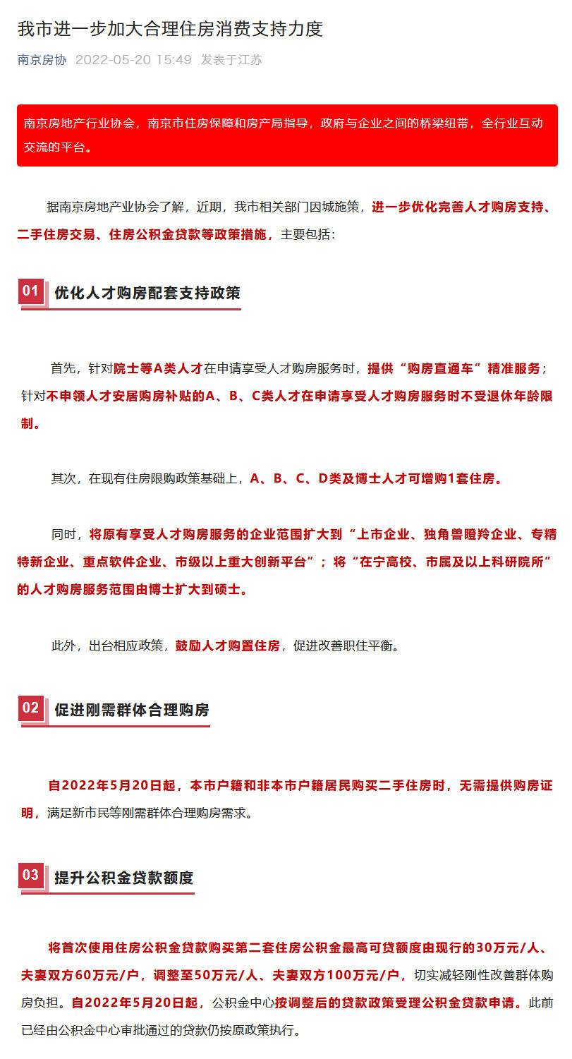 在这篇5月20日15点49分发表的“官宣文”中,共计提到了3项房地产“因城施策”的新举措,包括优化完善人才购房支持、二手住房交易、住房公积金贷款等。其中最惹人关注的当属二手房新政,文中提到,“自2022年5月20日起,南京本市户籍和非本市户籍居民购买二手住房时,无需提供购房证明,满足新市民等刚需群体合理购房需求。”