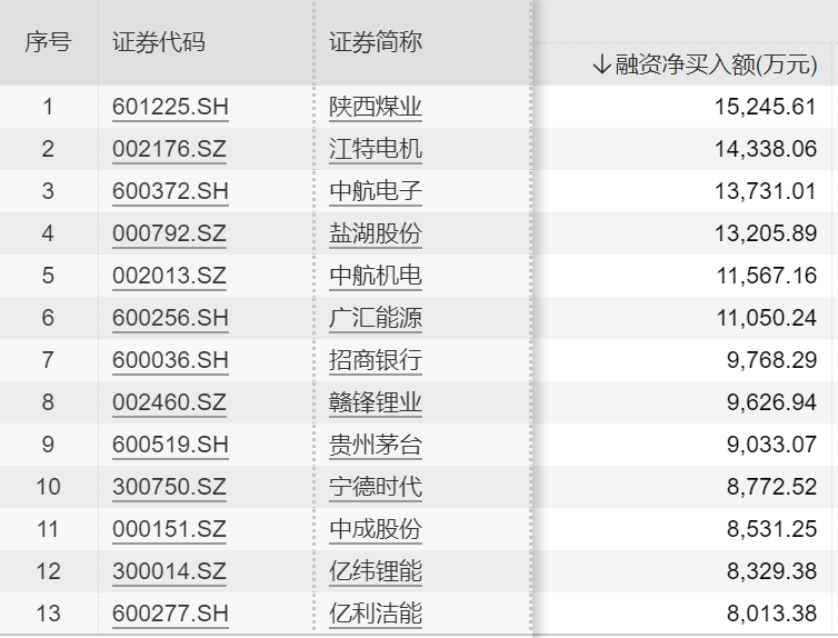 Wind统计显示,5月26日共有1034只个股获融资净买入,净买入金额在千万元以上的有183只,共有6只融资净买入额超1亿元。陕西煤业获融资净买入居首,当日净买入1.52亿元。江特电机、中航电子、盐湖股份获净买入居前,金额分别为1.43亿元、1.37亿元、1.32亿元;立讯精密、国电电力、天齐锂业遭净卖出居前,金额分别为2.22亿元、1.41亿元、1.34亿元。