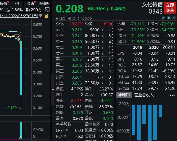 5月27日,文化传信跳水暴跌,截至发稿,该股跌68.96%。此前,该股一度跌80%至0.1港元,市值一度跌至1.66亿港元。