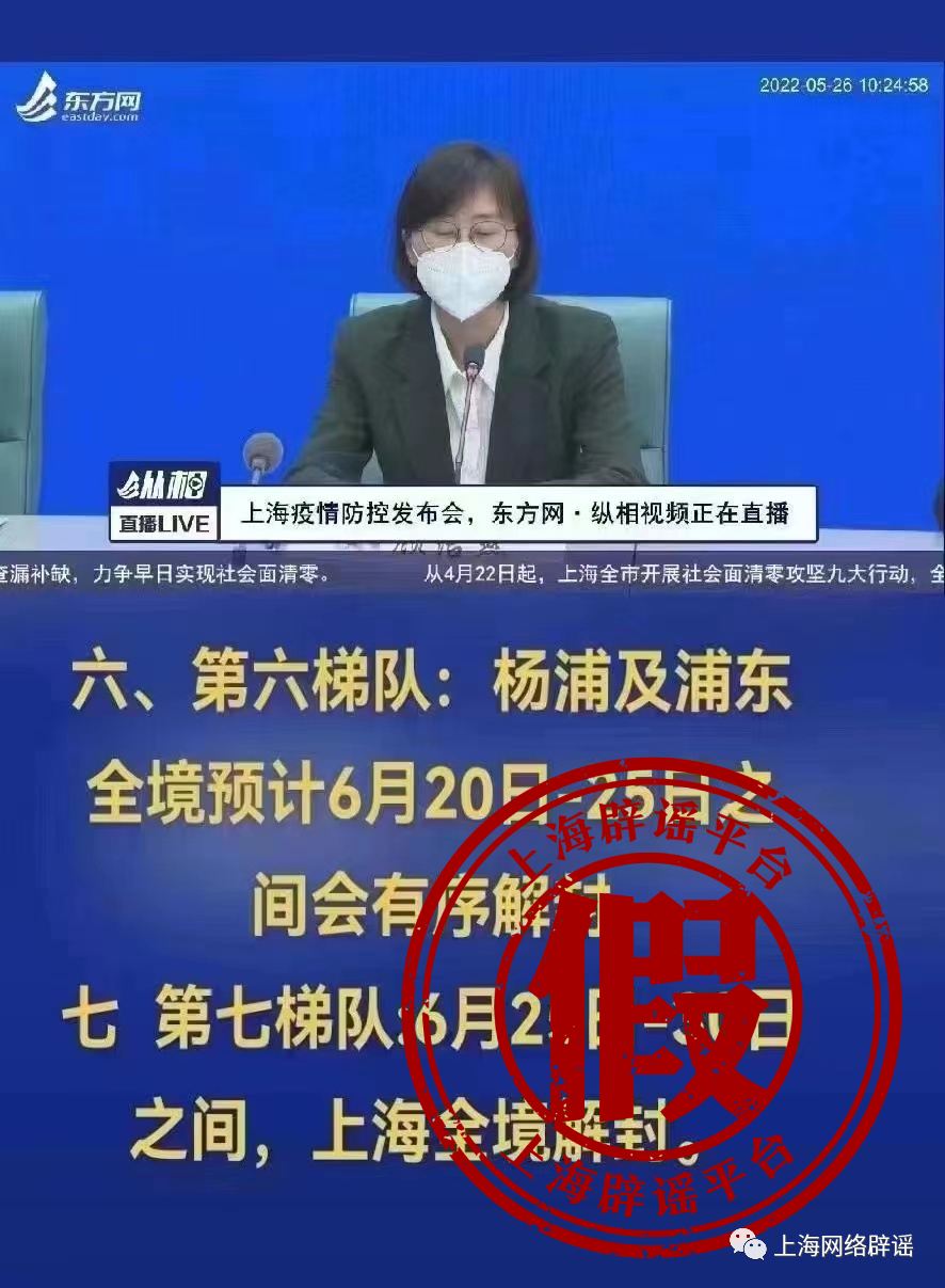 5月27日,上海辟谣平台接到很多网友留言,询问网传“上海解封将有七个梯队”的视频及截屏是否属实,因为相关视频和截屏使用了上海市新冠肺炎疫情防控工作新闻发布会的现场直播画面。经核查,相关信息不实,属于移花接木的造谣行为。