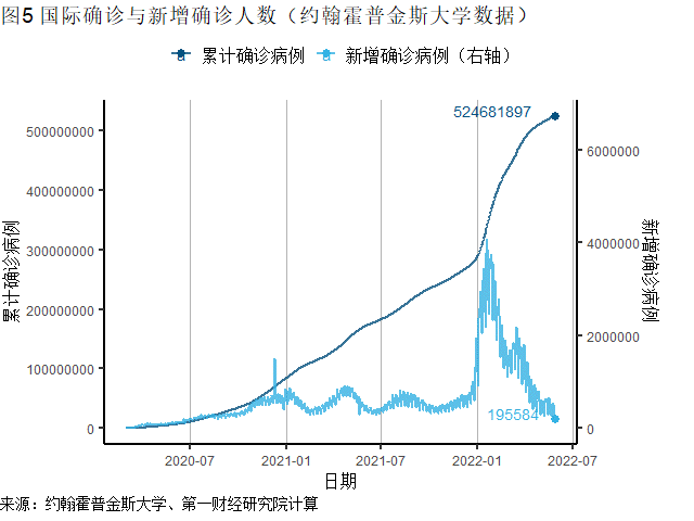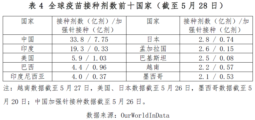 根据OurWorldInData的数据,截至5月28日全球新冠肺炎疫苗累计接种118.2亿剂,此前一周新增接种0.54亿剂,其中约46%为加强针接种。