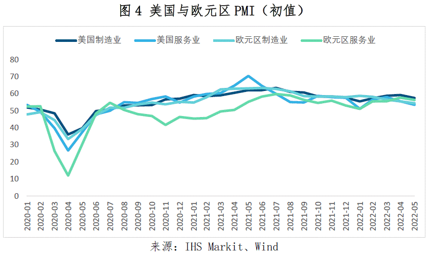 主要发达国家经济活动承压,根据IHS Markit的数据,5月美国与欧元区制造业与服务业PMI初值均在走低。5月美国与欧元区制造业PMI分别降至57.5与54.4,其中欧元区制造业PMI已经连续4个月下降,创18个月新低;单月来看,欧美服务业PMI下降更为显著,美国(53.5)与欧元区服务业(56.3)PMI分别下降2.1与1.4,约为制造业PMI降幅的125%。欧美经济下行压力主要与高通胀拖累需求增长有关,此外供给受限与货币政策收紧预期下经济前景不明朗也在影响企业的商业预期。
