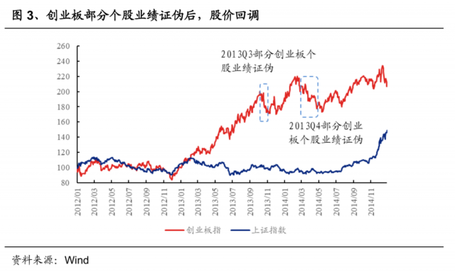 2013Q3-Q4创业板部分个股业绩不及预期,“被证伪”,直到“新故事”的出现,跟着2014年下半年-2015年上半年的牛市股价再次上涨。2013Q2,创业板个股普遍业绩亮眼,有29家公司真实净利增速高于预告增速的上限(定义为“超预期”,下同),28家公司真实净利增速低于预告增速的下限(定义为“低于预期”,下同,彼时创业板有业绩预告的公司仅333家)。在“亮眼”中报的催化下,2013Q3创业板再度大幅上涨。