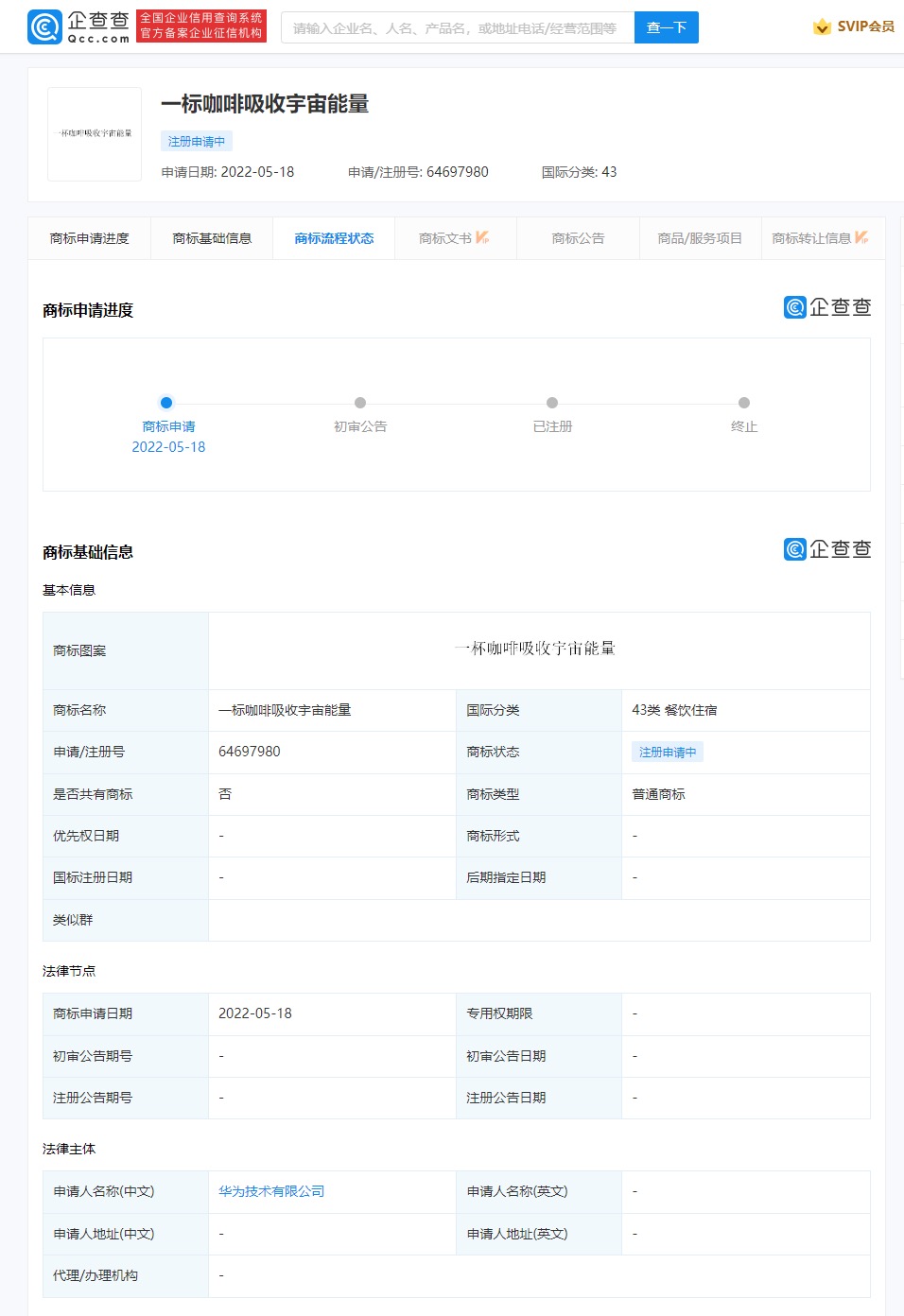 企查查APP显示,近日,华为技术有限公司申请注册“一标咖啡吸收宇宙能量”,国际分类涉及43类 餐饮住宿,当前商标状态为注册申请中。