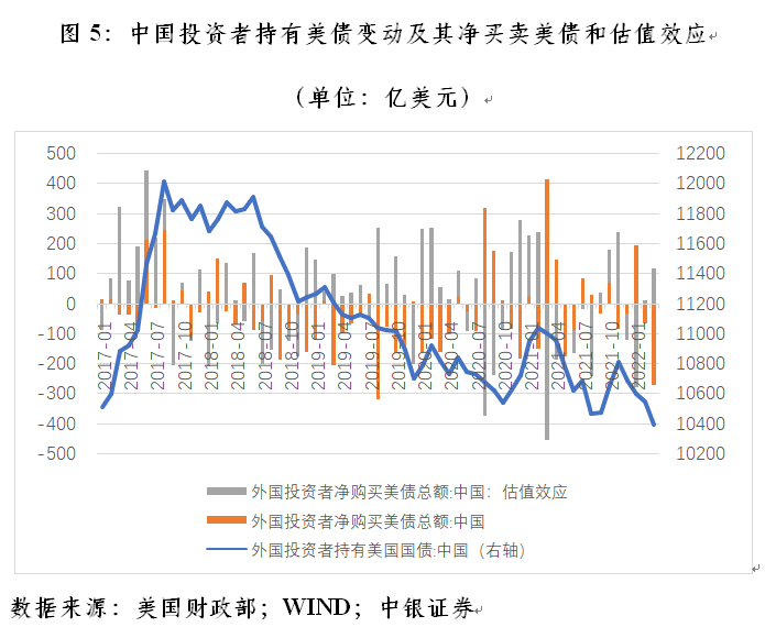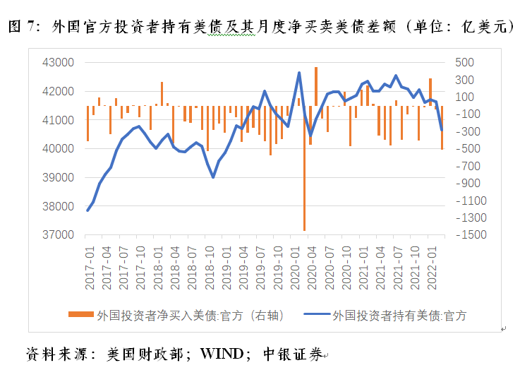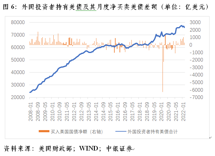 具体来讲,奥巴马政府任期内的2009年初~2016年底(其中2014年初以来美联储启动量宽退出),外国投资者持有美债余额累计增加29256亿美元,其中,净买入美债18622亿美元,占比64%,正估值效应10634亿美元;特朗普政府任期内的2017年初~2020年底(其中2018年底之前美联储实施货币政策正常化操作,2019年中起重启货币宽松,2020年初开启“零利率+无限量宽”),外国投资者持有美债余额增加10679亿美元,其中,净卖出美债8605亿美元,占比-81%,正估值效应19284亿美元;拜登政府任期内的2021年初~2022年一季度末(其中2021年11月份以来启动货币紧缩进程),外国投资者持有美债余额增加5428亿美元,其中,净买入美债2618亿美元,占比48%,正估值效应2811亿美元(见图6)。