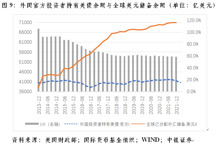 分部门看,到今年3月底,外国投资者持有美债中,官方投资者占比53.4%,较上年底回落0.3个百分点,创下有数据以来新低,2013年底该项占比为70%(见图8)。这表明美债外国投资主体越来越分散化、市场化。对外国官方投资者持有美债占比与全球美元储备份额的相关性分析结果显示,2013年四季度~2021年四季度,二者为较强的正相关0.753。