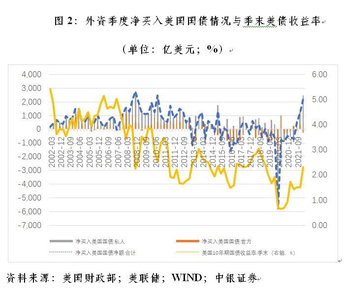 这其实并不出人意料。一方面,美债收益率飙升,当季10年期美债收益率上行了80BP(2016年四季度上行85BP),增强了美债对外国投资者的吸引力(见图2);另一方面,美债价格下跌,也通过资产再平衡效应,倒逼国际资本增加美债资产配置。