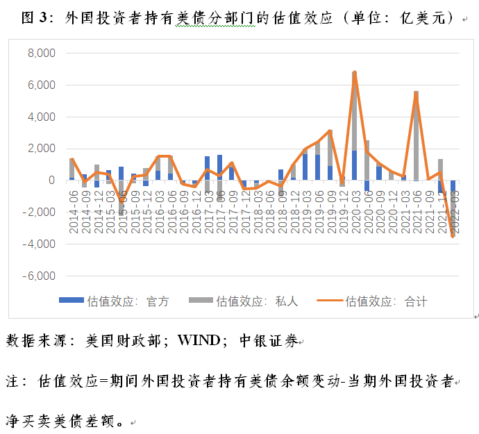 今年一季度,由于美债收益率飙升,美债价格相应下降,导致外国投资者持有美债按市值重估后减少。据估算,同期,外国投资者持有美债负估值效应3536亿美元(除估值效应外,还包含了统计原因引起的非交易调整,下同),贡献了外国投资者持有美债降幅的264%,其中:外国官方投资者负估值效应664亿美元,贡献了外国官方投资者持有美债降幅的71%;外国私人投资者负估值效应2872亿美元,贡献了外国私人投资者持有美债降幅的713%(见图3)。可见,不论从外国官方还是私人投资者来看,负估值效应都是其持有美债余额变动的主要贡献项。总的来讲,外资是在主动增持美债,只是由于负估值效应导致持有美债余额被动减少。外资抛售美债是一种“数据幻觉”。