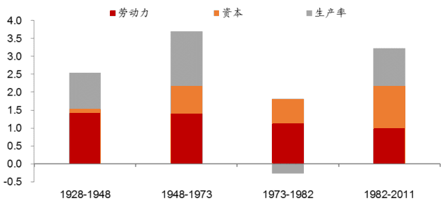 从有关资料中发现,美国1929-1982年间经济年化增长率为2.92%,其中1.34%来自劳动力贡献,0.56%来自资本,1.02%来自生产率提高。人口增长的贡献是最多的,也是最稳定的。如劳动生产率提高也需要靠年轻人(专利发明、技术进步),故资本回报率高低与人口老龄化的程度相关。