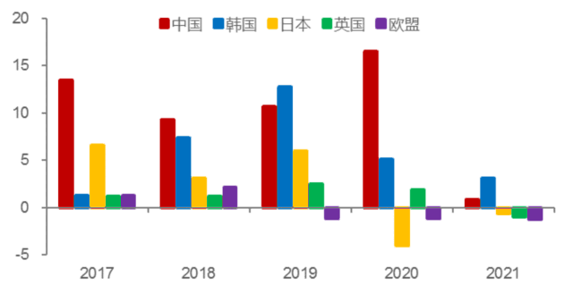 以下为中、韩、日、英和欧盟的国际专利申请数量的增速变化,发现从2015年至2021年,中国的专利申请数量增长了1.33倍,韩国增长42%,日本和英国分别只增长14%和10%。