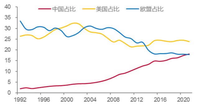例如,1992年的时候,美国GDP在全球的份额为26%,欧盟为33%,中国只有2%,到了2021年,中国提高到18.1%,美国降至23.9%,欧盟更是降至17.8%。