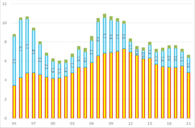 全要素生产率(蓝色)对经济增长的贡献率在1997年之前非常高,之后则逐步回落;2007-2010年间又有所回升(进入重化工业化的冲顶阶段),2011年以后全要素生产率增速和对GDP增长的贡献率都显著下降。