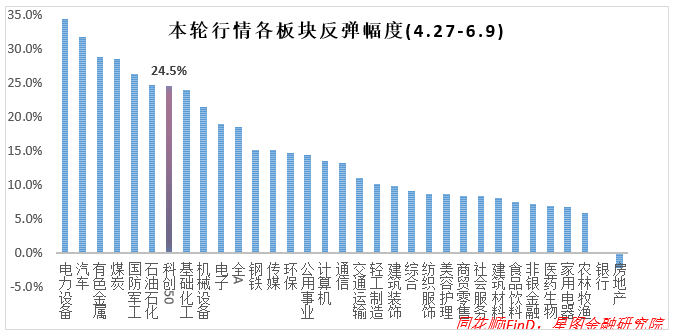 4月27日-6月9日,申万一级行业涨幅前五名分别为电力设备、汽车、有色金属、煤炭和国防军工,主要是成长和资源板块(全球通胀逻辑)。科创50指数涨幅24.5%,放在其中可排第七位。