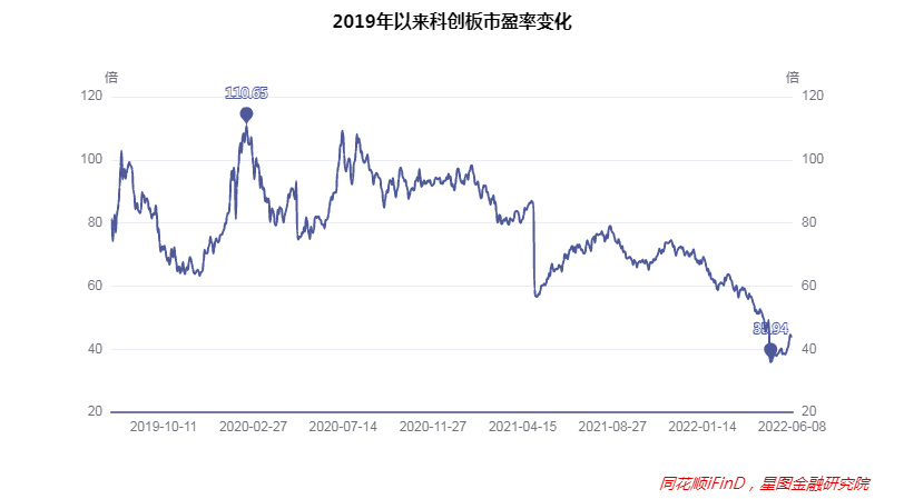 科创板于2019年7月22日开板,至2022年运行2年时间,期间估值水平从最高110.65倍跌至今年最低35.94倍,估值水平同样大幅消化。