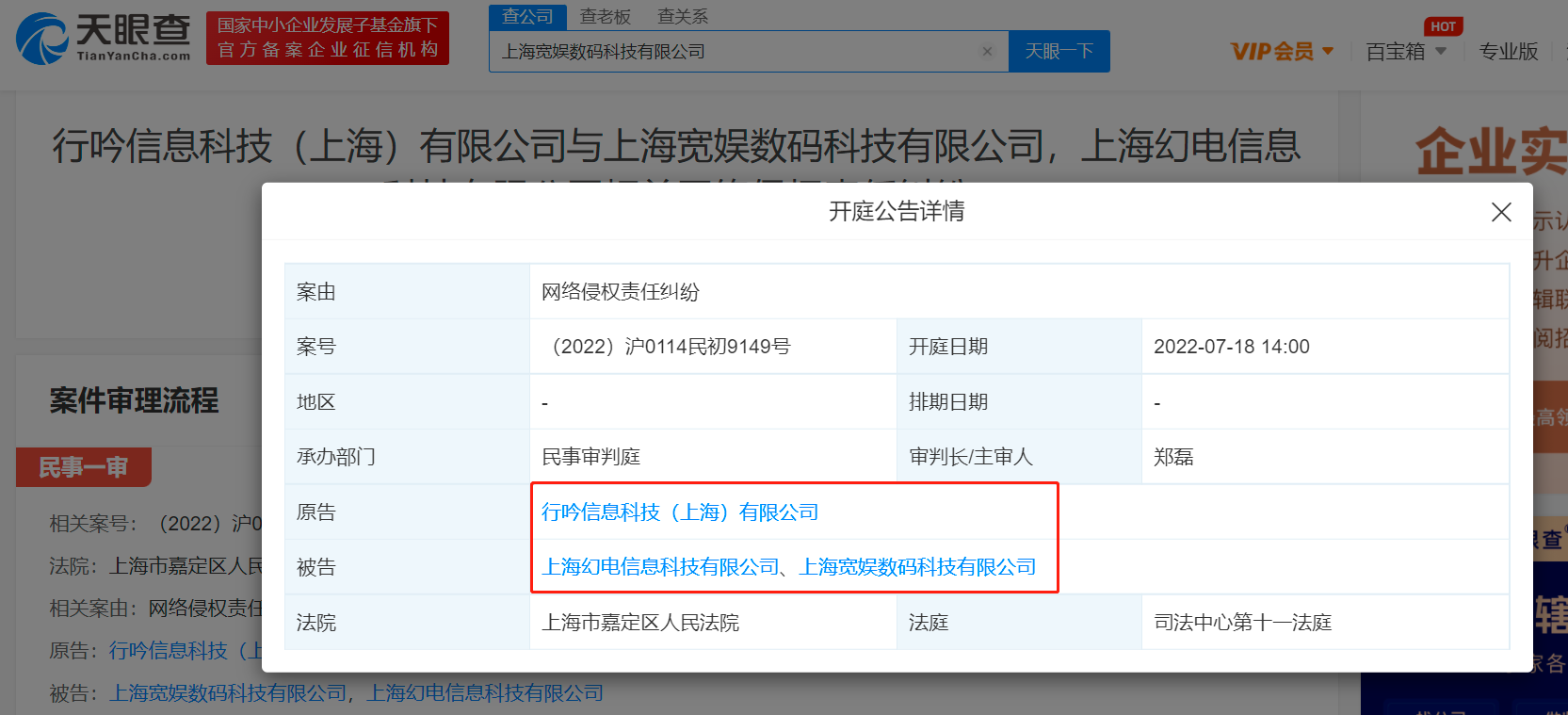 天眼查App显示,近日,小红书关联公司行吟信息科技(上海)有限公司与B站关联公司上海幻电信息科技有限公司、上海宽娱数码科技有限公司网络侵权责任纠纷新增开庭公告,原告为行吟信息科技(上海)有限公司,案件将于7月18日在上海市嘉定区人民法院开庭。