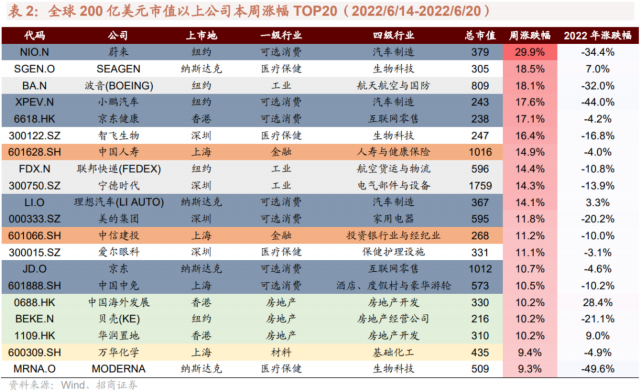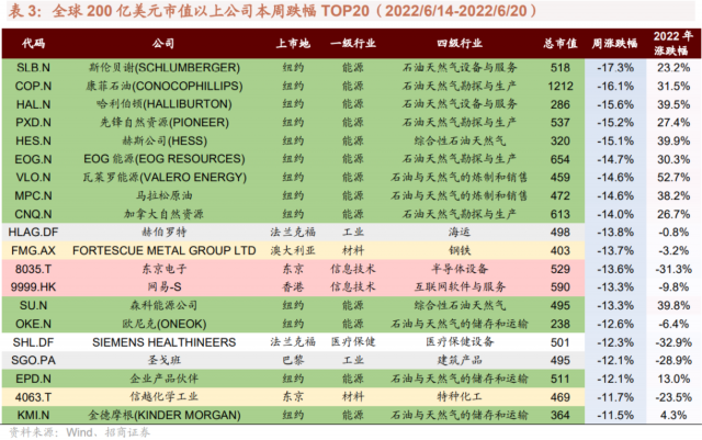 过去一周大涨的200亿美元以上市值公司中,可选消费、医疗保健较多,过去一周领跌的200亿美元以上市值公司中,能源较多。