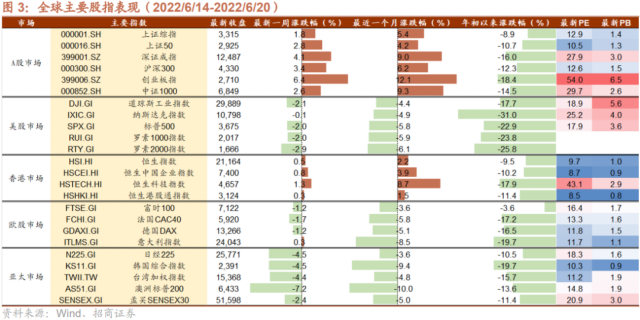 上周全球股市涨跌不一。美股方面,道指、纳指、标普分别下跌2.1%、0.1%、2.0%。过去一周市场主要关注美联储议息会议、美国对华关税表态、俄乌局势等方面。美联储议息会议方面,6月15日美联储6月议息会议决定加息75bp至1.5-1.75%。最新点阵图显示,大部分美联储官员预计年底前加息至3.0-3.5%,2023年底前加息至3.5-4.0%,2024年开始回落但仍高于3%。美联储还发布被称为“迄今为止最鹰派抗击通胀措辞”的最新半年度货币政策报告称:“FOMC货币政策委员会致力于恢复物价稳定——这是维持强劲劳动力市场所必需的——是无条件的。”会后鲍威尔表示,7月会议将会考虑加息75bp或者50bp,但75bp的加息幅度不会常态化。美国对华关税表态方面,6月14日,美国白宫发言人皮埃尔证实,拜登及其内阁目前正在就减免部分对华加征关税的问题进行研判,以缓解美国通胀。6月18日美国总统拜登接受记者采访时暗示,关于放宽对华关税一事,他越来越接近于做出决定。俄乌局势方面,1)欧洲天然气荒:6月16日俄罗斯称因“技术性”原因,减少通过北溪管道供应欧洲的天然气。美国最主要的液化天然气出口商之一,自由港天然气公司德克萨斯州金塔纳岛工厂上周三相继发生爆炸和火灾并导致停产。两者共同导致上周欧洲天然气价格暴涨60%。2)乌克兰入欧盟最新进展:6月17日欧盟委员会建议给予乌克兰和摩尔多瓦欧盟候选国地位,预计欧盟成员国领导人将在下周举行的峰会上就此议题进行讨论。