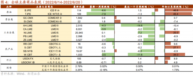 欧股市场跌多涨少,富时100、法国CAC40、德国DAX分别下跌1.2%、1.7%、1.2%,意大利指数上涨0.3%。6月16日,英国央行公布的利率决议显示,英国央行如期加息25个基点,将政策利率提高至1.25%。英国央行首席经济学家Huw Pill暗示,如果有进一步的证据表明高通胀正在推高工资或物价,决策者或采取加息50个基点的史无前例行动。6月26日欧洲央行行长拉加德称,一旦实力较弱的国家借款成本升得太高或者太快,欧洲央行会启用新的对抗危机工具。假如债券息差扩大到超过特定的门槛,或者市场波动超过特定速度,就可能触发欧央行使用新工具。日经225指数下跌4.5%。6月17日利率决议后的发布会上,黑田东彦表示,将10年期国债收益率目标维持在0%,附近收益率曲线控制(YCC)目标没有变,没有看到维持宽松政策的限制,没有考虑提高10年期国债收益率目标上限,日元贬值方面,日本央行没有设定特定汇率水平目标,没有实施针对外汇的货币政策。