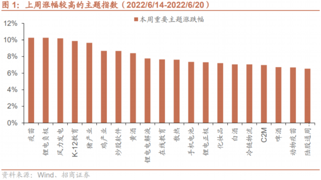 上周,A股涨幅较高的产业指数为:疫苗、锂电负极、风力发电等。