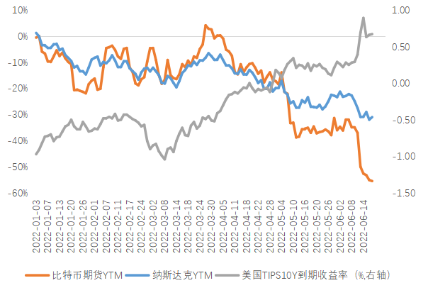 6月第3周,10Y美债利率冲高回落,周内站上3.5%,收于3.25%,10年期美债实际利率上行28bp至0.67%,金融条件进一步恶化。纳斯达克指数和比特币与实际利率高度负相关,因此下跌更加明显。年初至今,纳斯达克下跌31%,CME比特币期货下跌超50%。