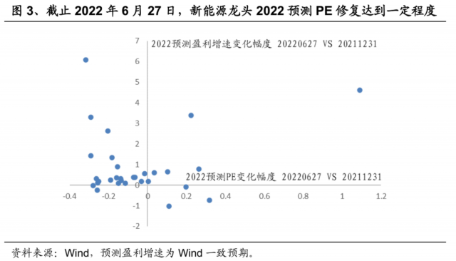 估值修复达到一定程度,等待业绩进一步催化。截止2022年6月27日,新能源龙头2022预测PE平均回落幅度已经减小至5%,盈利预测平均上修幅度为91%。从图3来看,与乐观情形相比,PE和G的变化幅度已经接近于具有线性相关性,意味着估值修复可能已经达到一定程度。但是需要指出的是,由于分析师盈利预测具有比较大的滞后性,我们这里的盈利预测上修幅度可能是偏保守的。等到中报业绩披露后,分析师对全年盈利和2023年盈利的上修,有望进一步打开估值向上空间,成为股价上涨新的催化。