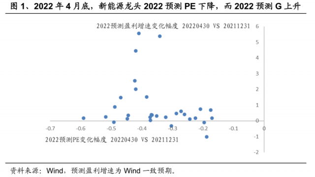与乐观情况相比,2022年4月底的新能源龙头是估值下杀与盈利上修的严重背离。2022年4月底,由于此前美联储加息缩表、俄乌冲突以及上海疫情等一系列外生事件冲击,A股场内流动性一度进入恶性循环。虽然此时的2022年新能源龙头的盈利预测相比2021年年底已经大幅上修,但是由于股价的接连受挫,2022年的预测PE却大幅下降。与2021年12月底相比,2022年4月29日新能源市值前30的龙头股,预测PE平均回落35%,而预测盈利增速平均上升幅度却达到91%。