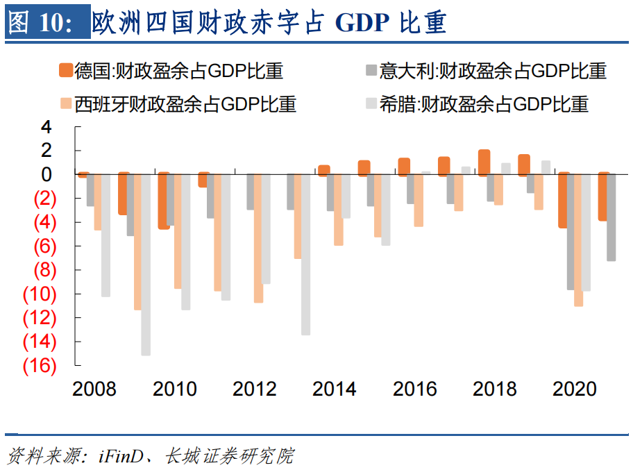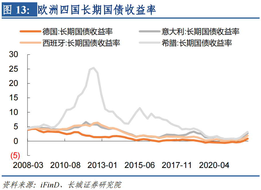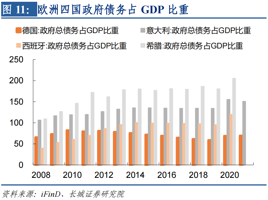 欧央行逐步进入货币紧缩,欧洲利率上升在控制通胀的同时也会引发经济衰退,而到时欧元区政府将面临再融资问题。上一次欧债危机还在投资者以及各国政要的记忆当中,当下市场又开始担忧欧洲弱国的融资能力和政府债务状况。受疫情冲击,2020年和2021年德国和意大利的财政赤字均为负,西班牙和希腊的2020年财政赤字也为负,并且西班牙的财政赤字/GDP比例与2009年差不多,希腊的财政赤字/GDP比例与2008年差不多。西班牙和希腊在2010年至2013年间并未减少这一财政指标的危险程度,最终酿成欧洲债务危机。当前欧洲多数国家的政府债务占GDP比例都远远高于2008年,比如意大利从2008年的106%上升至2021年的150%,西班牙从2008年的40%上升至2020年的120%,希腊从2008年的109%上升至2020年的205%。