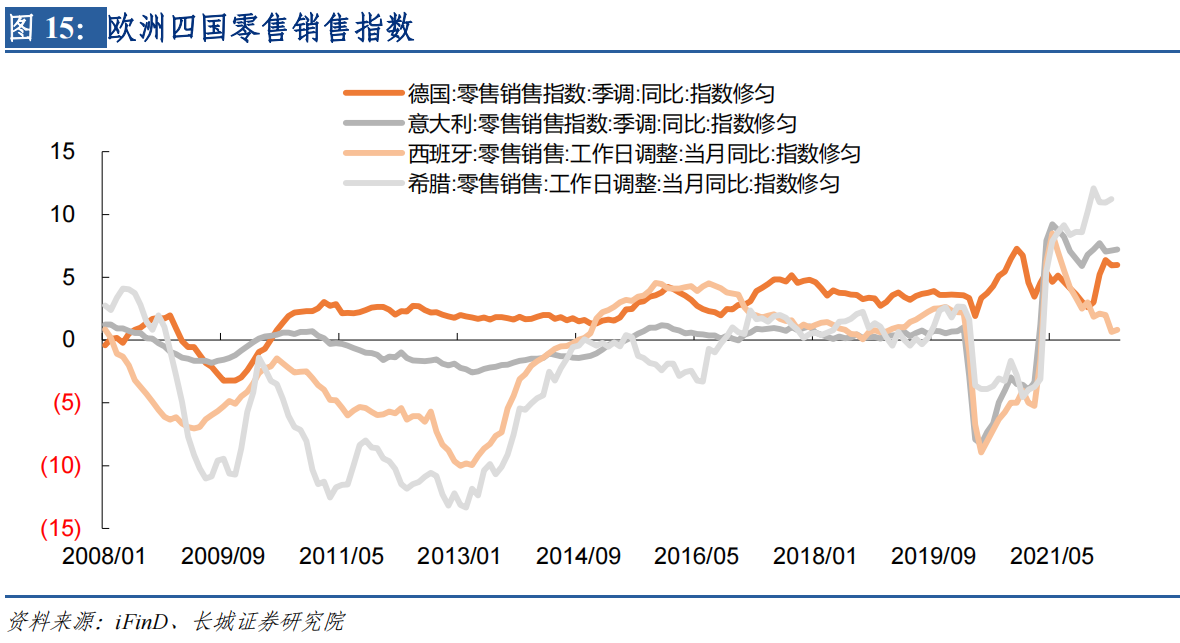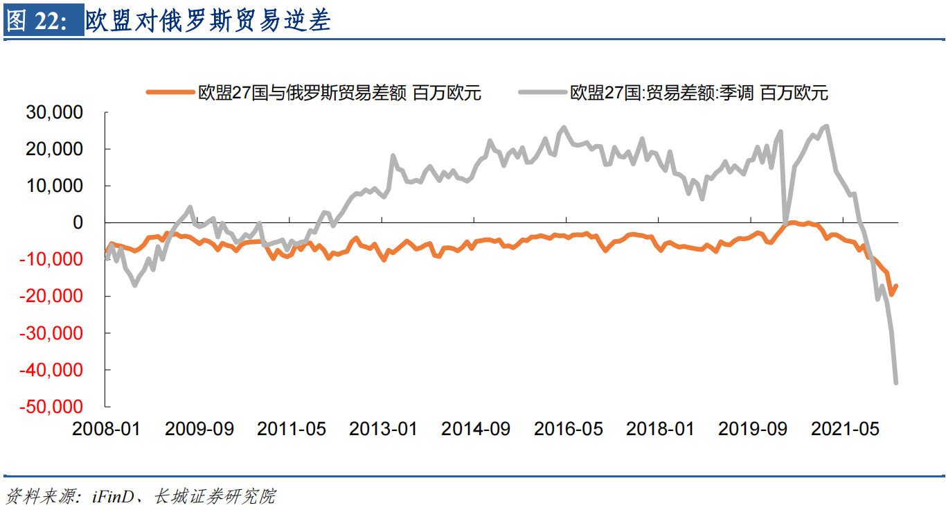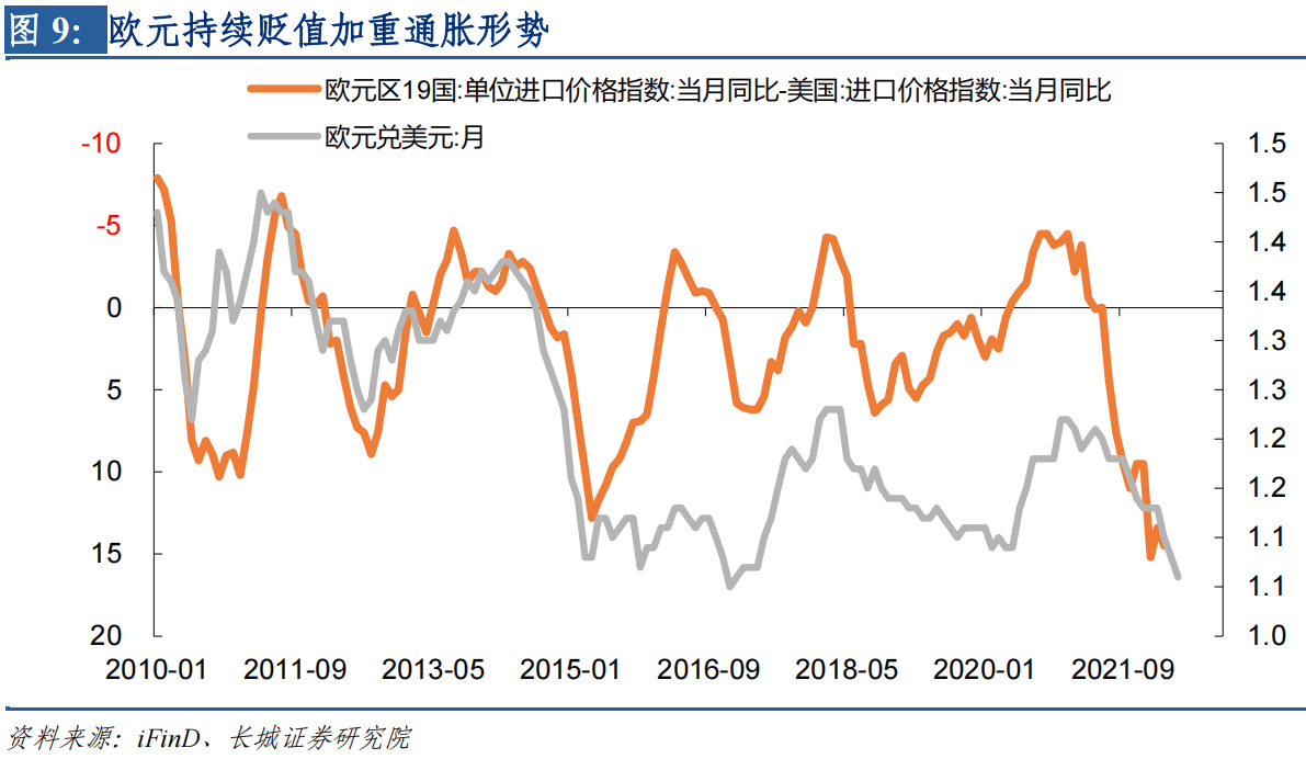 欧洲贸易差额由正转负是乌冲突以及北约对俄罗斯的制裁造成的。这些政治事件造成北约进口油气成本大幅抬升,贸易条件恶化,上文中已经比较了欧元区PPI同比与美国PPI同比走势。美国PPI趋于稳定高位后,欧元区PPI后来居上,反超美国PPI,目前仍未出现放缓迹象。