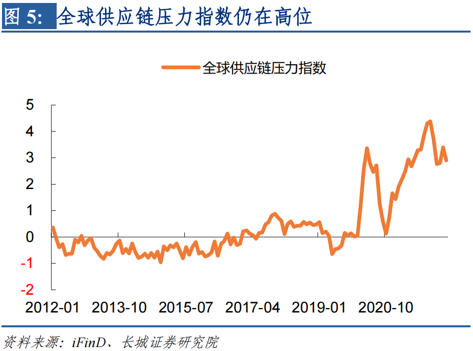 第三,供应链冲击导致成本上涨。除了能源价格上涨外,供应链危机也造成制造业成本上行,推动欧洲通胀。纽约联储全球供应链压力指数5月份为2.9,虽然已经从高点回落,但从历史来看仍然处于高位。2020年5月开始,欧美PPI上行,且美国PPI早期增速快于欧洲。但俄乌冲突加剧欧洲供应危机,欧元区4月PPI同比37.2%,远高于美国的21.7%。欧洲制造业成本后来居上,增大通胀压力。