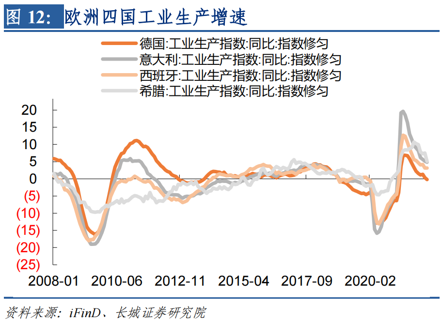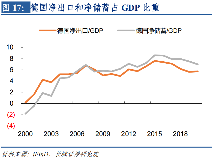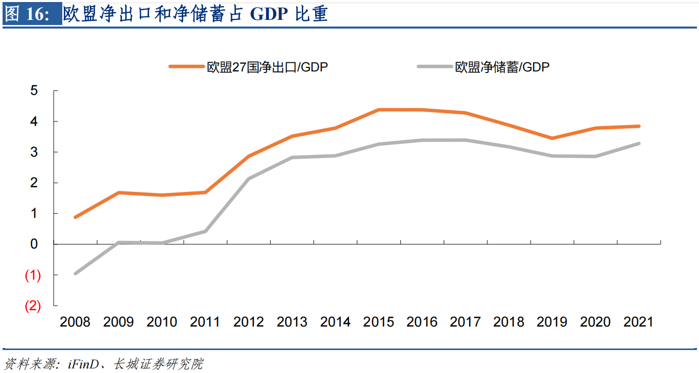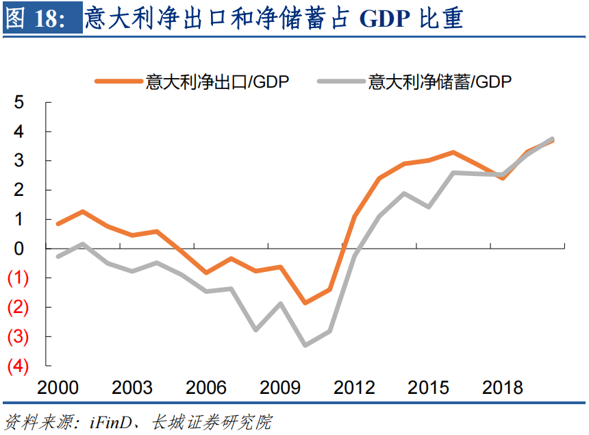 其次,经过上次欧债危机之后,欧洲主要国家都在提高本国储蓄率,降低债务依赖度以及增加对出口的支持。2010年时欧盟的净储蓄比例接近于0%,当前已经回升至3%以上。其中德国在2000年金融危机之后就大幅提升本国储蓄率,因此在2008年金融危机之时,已经有较强的出口能力和抵御风险能力;这为其他欧洲国家提供了榜样,因此2010年欧债危机之后,意大利、西班牙和希腊的储蓄率均明显抬升,目前意大利和西班牙的储蓄率和净出口占GDP比重均为正,只有希腊仍然处于负值。