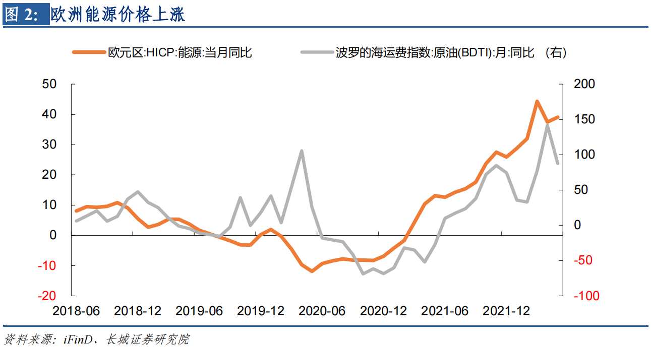 欧洲的通胀问题是多方面共同作用的结果。第一,俄乌冲突造成欧盟能源价格奇高。欧盟和俄罗斯的相互制裁不仅导致原油价格走高,而且运输成本也大幅抬升。能源占欧元区HICP的权重约为10.9%,2022年5月欧元区HICP能源同比增长39.1%,能源价格上涨导致欧洲通胀上行。