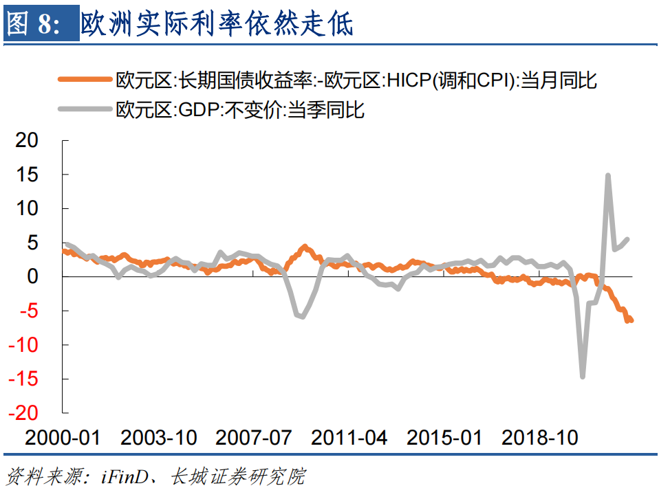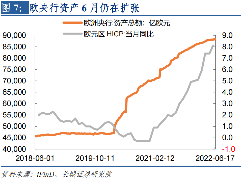 在应对通胀方面,欧央行和美联储一样,不仅货币调整滞后而且力度较弱。(1)欧央行资产负债表在通胀失控之后仍在扩张。截至到6月17日欧央行总资产为8.83万亿欧元,比6月初增长了100亿左右。(2)虽然名义利率大幅攀升,但实际利率仍然走低。5月份欧元区实际利率为-6.4%,实际利率的过低促使实际GDP同比大幅攀升,2022年一季度GDP增速为5.5%,明显高于过去二十年的平均增速。(3)欧元持续贬值加重通胀形势。2021年下半年开始,美元持续升值,欧央行没有跟随美联储逐渐收缩货币,导致欧元兑美元持续贬值,促使欧洲CPI同比增速超过美国CPI。