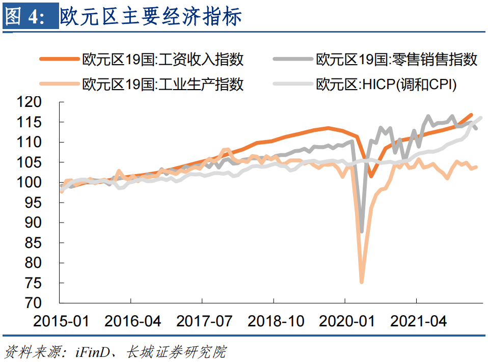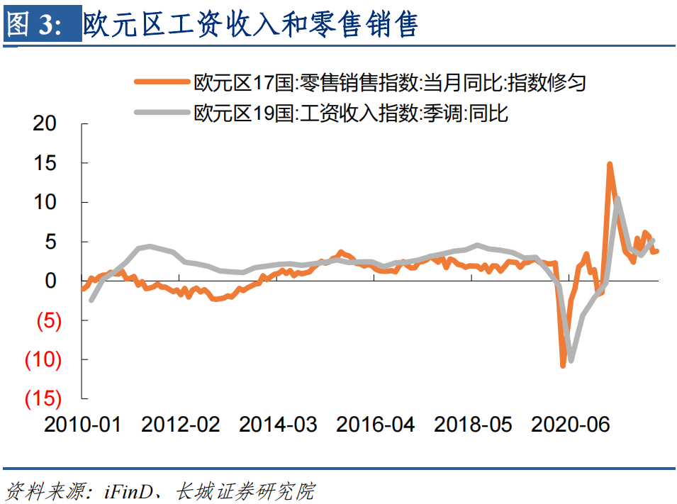 第二,欧洲内需依然旺盛,并且工资-通胀螺旋式上涨也在加强。截止到4月份欧元区零售销售总额同比为3.77%,虽然增速出现明显回落,但消费绝对值依然很高,与生产之间的喇叭口依然较大。同时一季度欧元区工资收入指数同比增速为5.13%,与销售一季度增速类似,两者都处于较快增长状态。