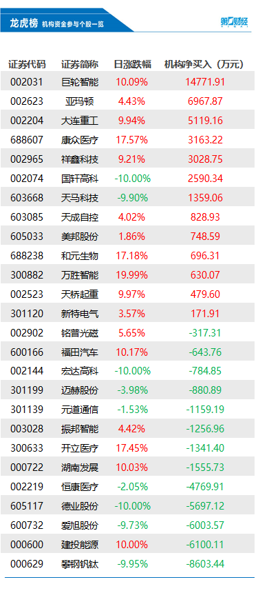 当天机构净买入前三的股票分别是巨轮智能、亚玛顿、大连重工,净买入金额分别是1.48亿元、6968万元、5119万元。