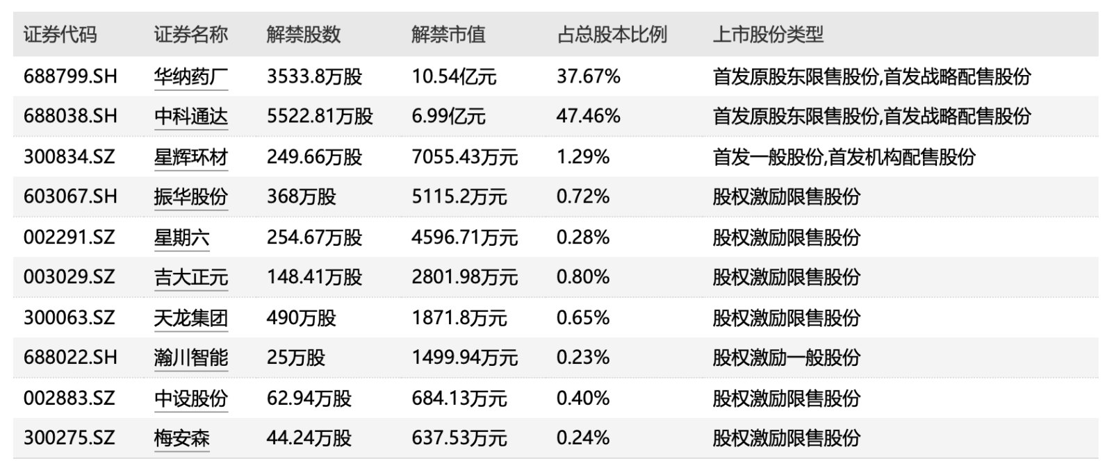 Wind数据显示,周三(7月13日),共有10家公司限售股解禁,合计解禁量为1.07亿股,按最新收盘价计算,合计解禁市值为19.95亿元。从解禁量来看,2家公司解禁股数超千万股。其中,中科通达、华纳药厂、天龙集团解禁量居前,解禁股数分别为0.55亿股、0.35亿股、0.05亿股。从解禁市值来看,2家公司解禁市值超亿元。其中,华纳药厂、中科通达、星辉环材解禁市值居前,解禁市值分别为10.54亿元、6.99亿元、0.71亿元。从解禁股数占总股本比例来看,2家公司解禁比例超10%。其中,中科通达、华纳药厂、星辉环材解禁比例居前,解禁比例分别为47.46%、37.67%、1.29%。