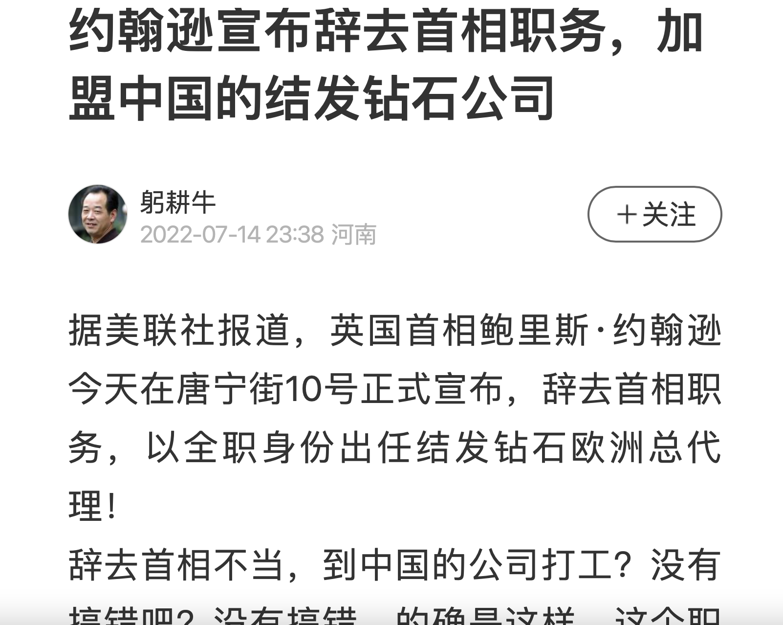 近日,网上有消息称,据美联社报道,约翰逊当日已经在唐宁街10号正式宣布辞去首相职务,并将以全职身份出任中国某钻石公司的欧洲总代理。这个职务的年薪是75万英镑,而他担任英国首相的年薪仅仅15.7372万英镑,几乎相当于首相年薪的5倍。