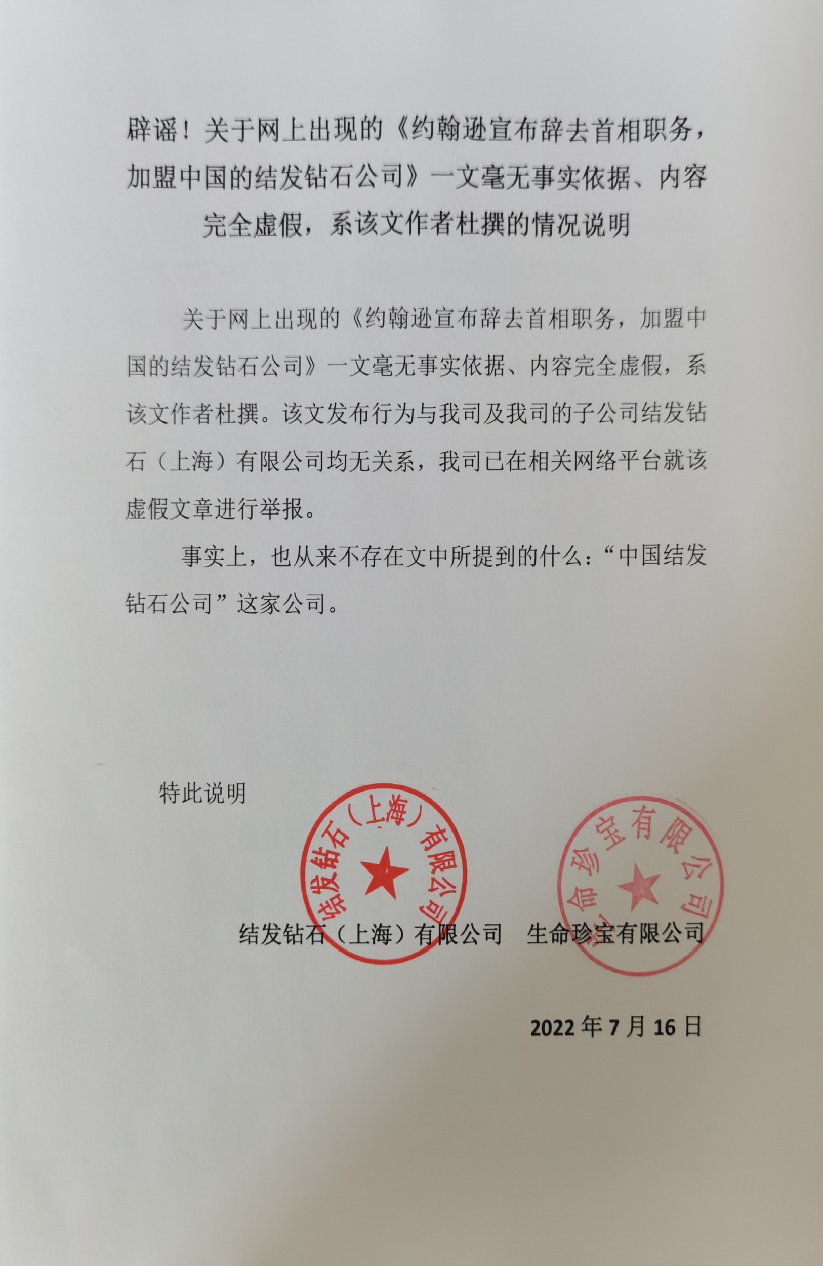 记者随后拿到了结发钻石(上海)有限公司和生命珍宝有限公司的正式声明,称“关于网上出现的《约翰逊宣布辞去首相职务,加盟中国的结发钻石公司》一文毫无事实依据、内容完全虚假,系该文作者杜撰。该文发布行为与我司及我司的子公司结发钻石(上海)有限公司均无关系,我司已在相关网络平台就该虚假文章进行举报。”