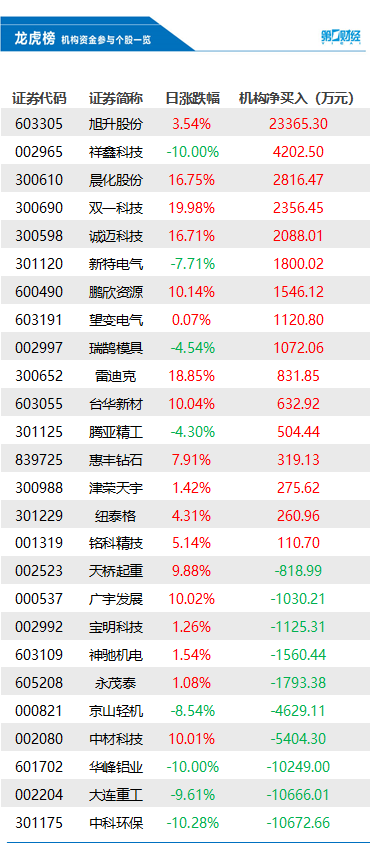 7月19日龙虎榜中,共26只个股出现了机构的身影,有16只股票呈现机构净买入,10只股票呈现机构净卖出。当天机构净买入前三的股票分别是旭升股份、祥鑫科技、晨化股份,净买入金额分别是2.34亿元、4203万元、2816万元。当天机构净卖出前三的股票分别是中科环保、大连重工、华峰铝业,净流出金额分别是1.07亿元、1.07亿元、1.02亿元。