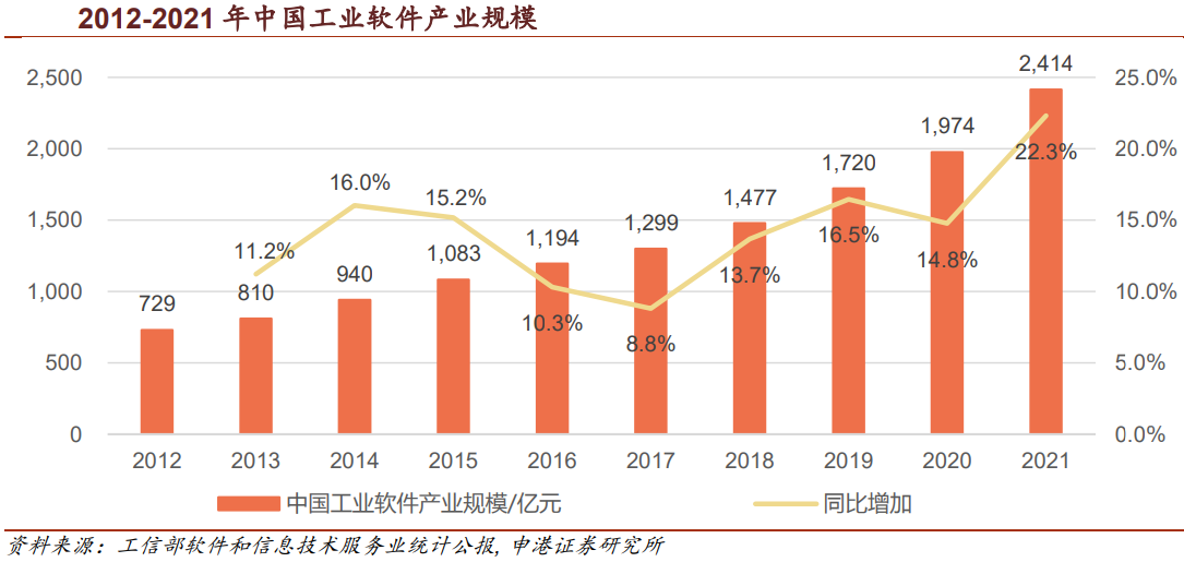根据工信部发布的各年度软件和信息技术服务业统计公报中的数据,2021年我国工业软件营收规模达到2414亿元,同比增长22.3%,近十年复合增速约14.2%。