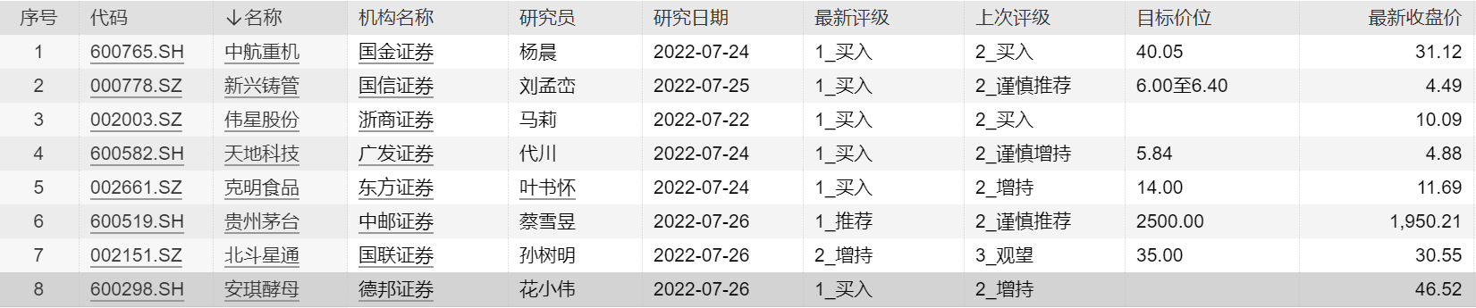 Wind数据显示,机构近五日调高8只个股评级,其中新兴铸管获国信证券“买入”评级,目标价6-6.4元;贵州茅台获中邮证券“推荐”评级,目标价2500元;北斗星通获国联证券“增持”评级,目标价35元;天地科技、克明食品、安琪酵母等均获机构推荐。