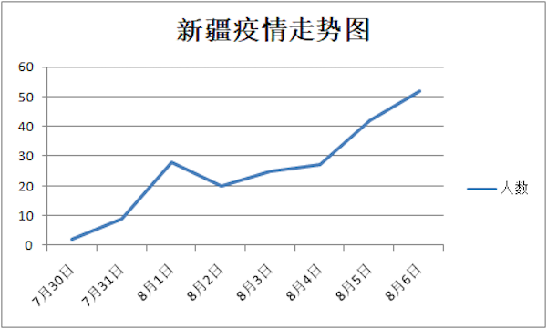 在8月6日报告的新增52例疫情中,除了伊犁州伊宁市和伊宁县外,又新增了3个地区,其中博州博乐市2例,阿克苏地区阿克苏市2例、拜城县3例。博乐、阿克苏和拜城的新发案例均有伊犁旅居史。