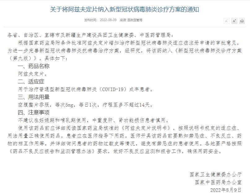8月9日,国家卫生健康委办公厅、国家中医药局办公室发布通知称,根据国家药监局附条件批准阿兹夫定片增加治疗新型冠状病毒肺炎适应症注册申请的审批意见,为进一步完善新型冠状病毒肺炎抗病毒治疗方案,经研究,将该药纳入《新型冠状病毒肺炎诊疗方案(第九版)》。用于治疗普通型新型冠状病毒肺炎(COVID-19)成年患者。用法用量:空腹整片吞服,每次5mg,每日1次,疗程至多不超过14天。