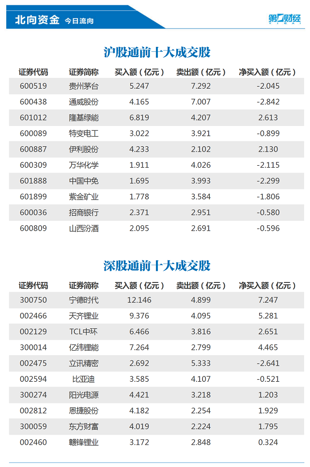 前十大成交股中,宁德时代、天齐锂业、亿纬锂能净买入额位列前三,分别获净买入7.25亿元、5.28亿元、4.47亿元。