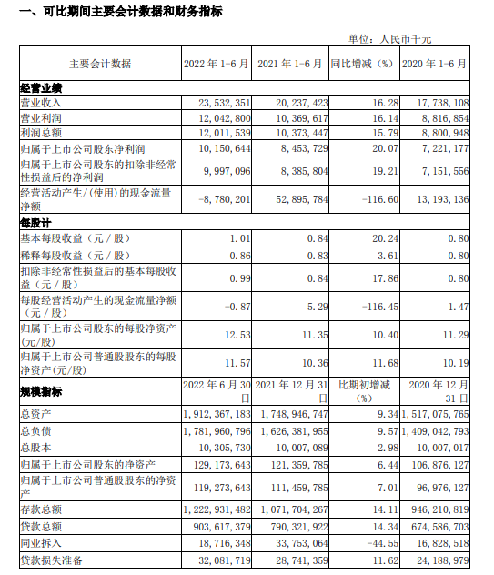 8月15日晚间,南京银行发布2022年半年度报告。报告数据显示,2022年上半年营业收入235.32亿,同比增长16.28%;归属于上市公司股东净利润101.51亿,同比增长20.07%;每股基本收益1.01元,同比增长20.24元。