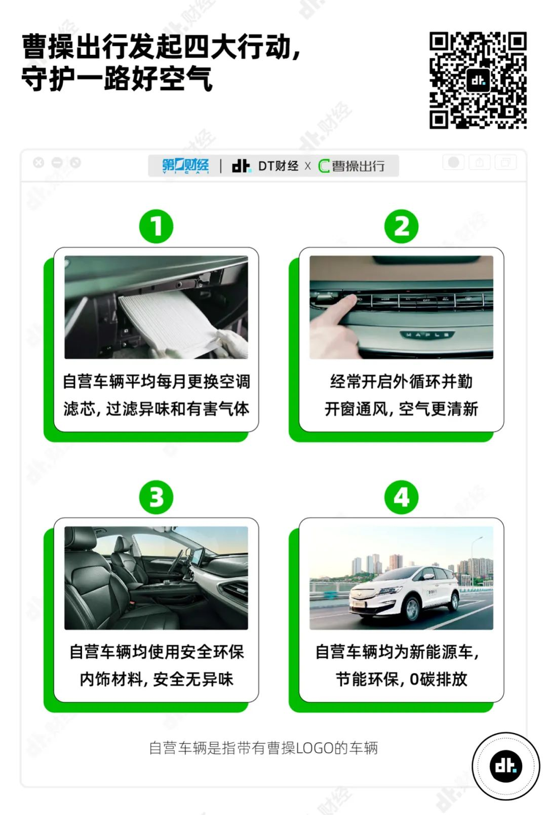 事实上,为解决网约车内的空气问题,曹操出行已经行动起来。曹操出行自成立以来,一直关注网约车车内空气问题。针对空气治理,发起四大行动,守护一路好空气。曹操出行通过定期更换空气滤芯、勤开窗,确保车内空气内、外循环充分;确保自营车辆均为新能源车,使用安全环保材料,使得乘车环境更加健康安全。