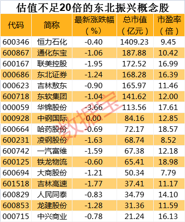 据统计,A股中布局东北振兴的概念股共有70股。数据显示,东北振兴概念股估值较低的概念股较为稀有,最新滚动市盈率不足20倍的股仅有17只,占比不足总数的四分之一,包括联美控股、中兴商业、人民同泰等。(数据宝)